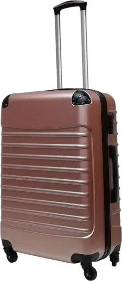 Grote ABS hardschalen koffer in kleur rosé gold. Koffer is voorzien van een ritssluiting rondom. Binnenin gevoerd en voorzien van tussenschot met ritssluiting en spanbanden. Koffer is op slot te zetten middels een vast cijferslot op de zijkant van de koffer. Handvat op bovenkant en zijkant en voorzien van een comfortabel 4-wiel systeem.
