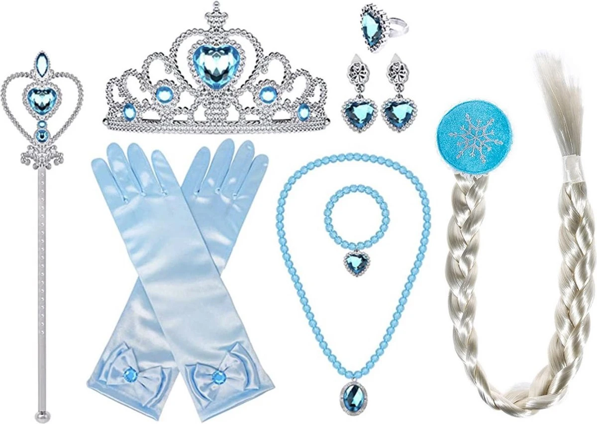 – Accessoireset; kroon, toverstaf, handschoenen, Elsa vlecht, juwelen.
