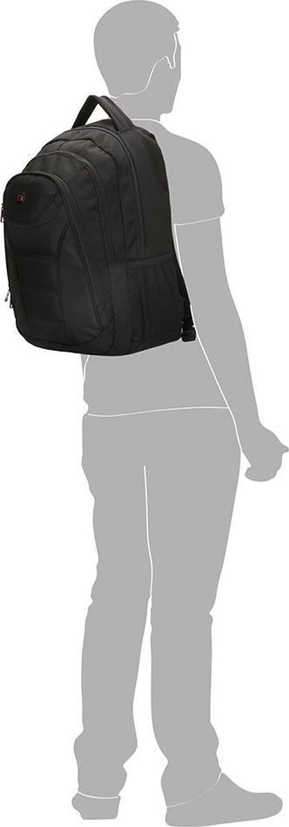 Bent u wel eens het overzicht kwijt? Dat is dan verleden tijd met deze overzichtelijk ingedeelde laptoprugzak. Deze zwarte Enrico Benetti laptoprugzak van de serie Cornell heeft ruimte voor een 15.6 inch laptop en beschikt tevens over een apart tablet vak. Tegenwoordig is op school of op het werk een laptop niet meer weg te denken. Bij deze rugzak bieden twee hoofdvakken voldoende ruimte om naast je laptop je overige boeken, schriften en papierwerk mee te nemen. Daarnaast zitten aan de voorkant twee extra vakken met ritssluiting en zitten er zijvakken voor bijvoorbeeld een drinkfles. Binnenin zitten nog eens twee extra vakken, waarvan één met ritssluiting. Deze laptoprugzak is gemaakt van licht en sterk polyester en sluit door middel van een ritssluiting.