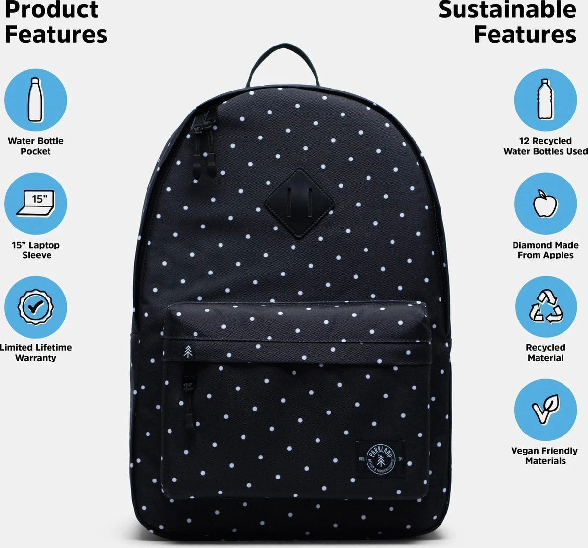 Heb je er ooit over nagedacht om te investeren in een multifunctionele dagrugzak die een leven lang meegaat? Wil je een betrouwbare rugzak die geschikt is voor bijna elke gelegenheid? Of ben je op zoek naar een rugtas voor jouw schoolganger die de gehele schooltijd meegaat? De Parkland Meadow is zo een veelzijdige rugzak. Het is een moderne rugtas die is ontworpen met het oog op stijl en duurzaamheid wat hem ideaal maakt voor school, reizen en alles daartussenin. Het hoofdcompartiment is een groot ritsvak dat beschikt over een dubbele ritssluiting en een huls waar een 15 inch laptop in past. Dit maakt van de Meadow een populaire keuze voor studenten die een kwalitatieve schoolrugzak nodig hebben. Er is veel ruimte voor je notitieboekjes, schoolboeken en andere schoolaccessoires. Verder wordt deze zak praktisch gemaakt door de verstelbare gewatteerde schouderbanden, voorvak met rits en een stevig handvat aan de bovenzijde. De tas kan ook dienen als reistas of sportzak waar je gemakkelijk een paar schoenen, een waterfles, toilettas, een reis kit en een handdoek in kwijt kunt. De goede kwaliteit van de rugzak ontleent zich aan haar duurzaam materiaal. Zo is de buitenkant van de Meadow gemaakt van gerecycleerd polyester vervaardigd uit waterflessen. Dit milieuvriendelijk materiaal is waterdicht en gemaakt om lang mee te gaan. Bestel deze stijlvolle tas van Parkland vandaag nog en ontvang hem binnen 1 à 2 dagen aan huis. Wij zijn officiële Parkland Supply verdeler dus je kunt natuurlijk rekenen op een volledige garantie. Herschel biedt levenslange fabrieksgarantie op alle Herschel producten.