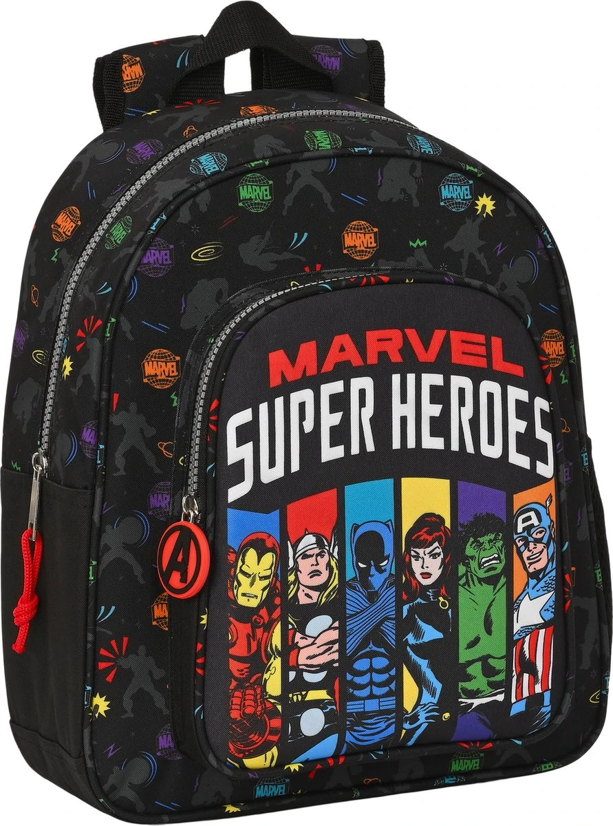 Marvel Avengers Rugzak, Super Heroes. Iron Man, Thor, Black Panther, Black Widow, The Hulk en Captain America; allemaal zijn ze vertegenwoordigd op deze stoere rugtas. Dé Marvel Avengers helden van dit moment! Welke is jouw favoriet? Deze tas heeft twee vakken met ritssluiting en een zijvak van mesh voor, bijvoorbeeld, een drinkbeker. Een ideale rugtas voor school of een dagje weg. Comfortabel te dragen door de gepolsterde en verstelbare schouderbanden. Een geweldig cadeau-idee voor een Avengers fan voor een verjaardag of de feestdagen.