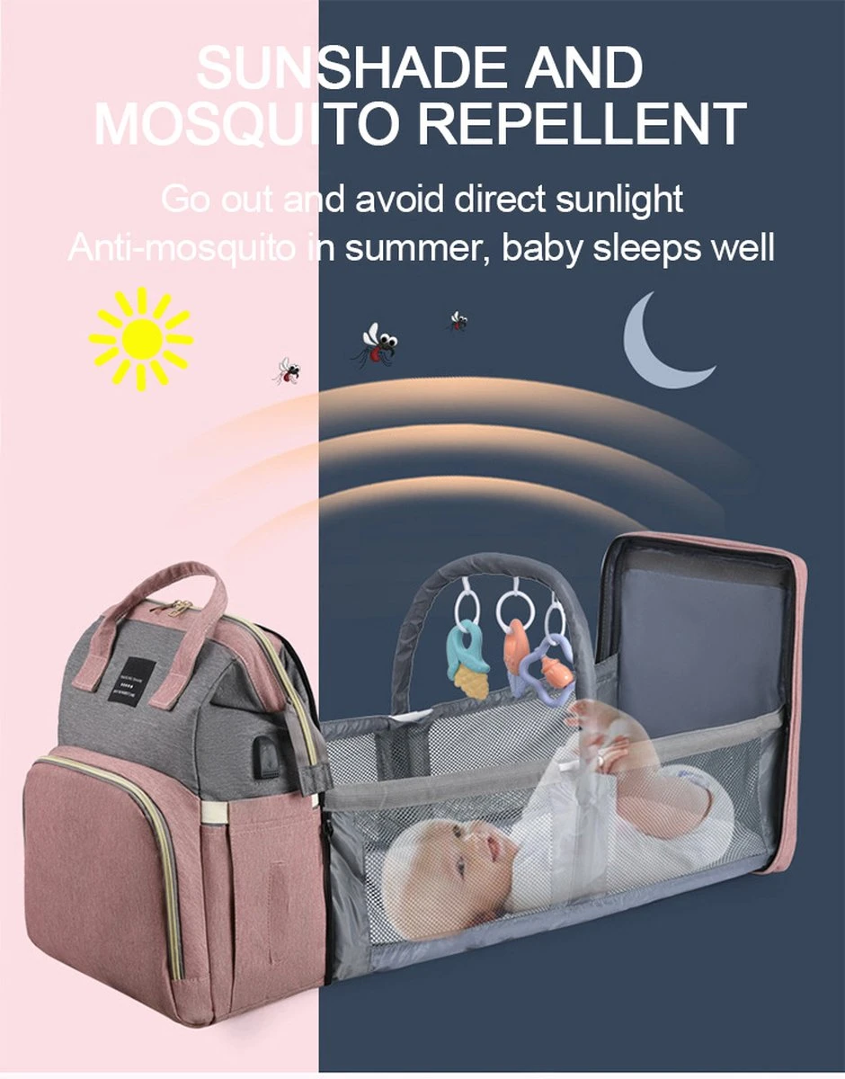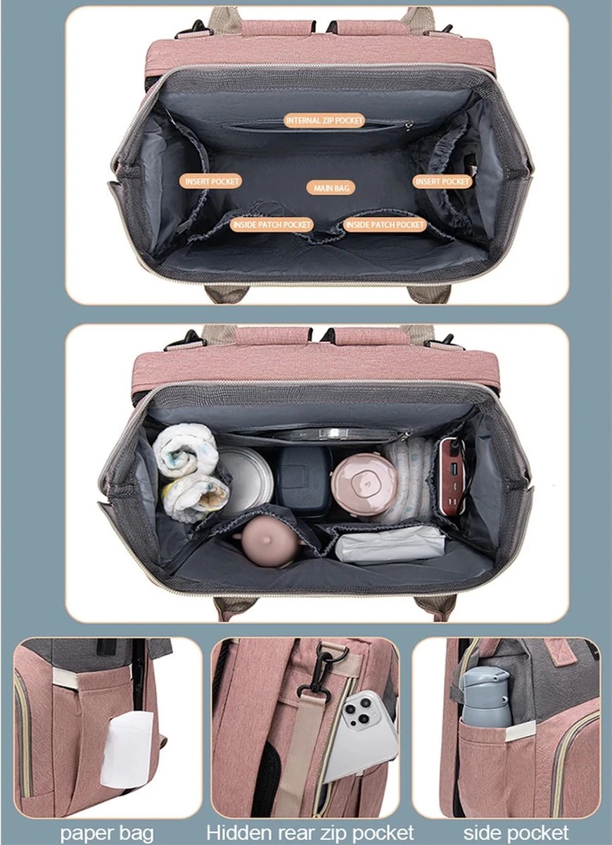 Merkloos Tas Voor Moeders En Vaders Met Uitklapbaar Baby Bedje – Draagbare Box – Rugzak Moeder – Roze – Met Veel Handige Opberg Vakken En USB Oplader – Klamboe – Mummy Bag – Verstelbaar